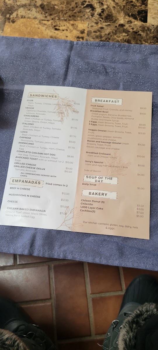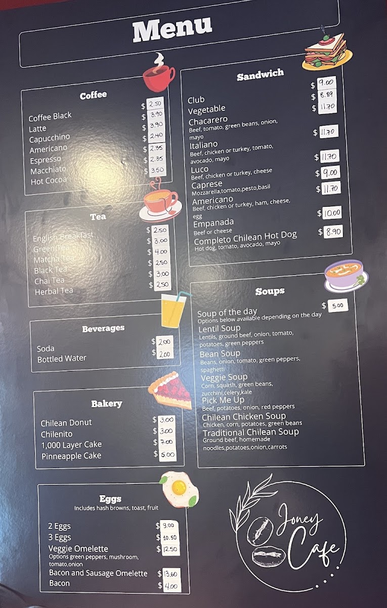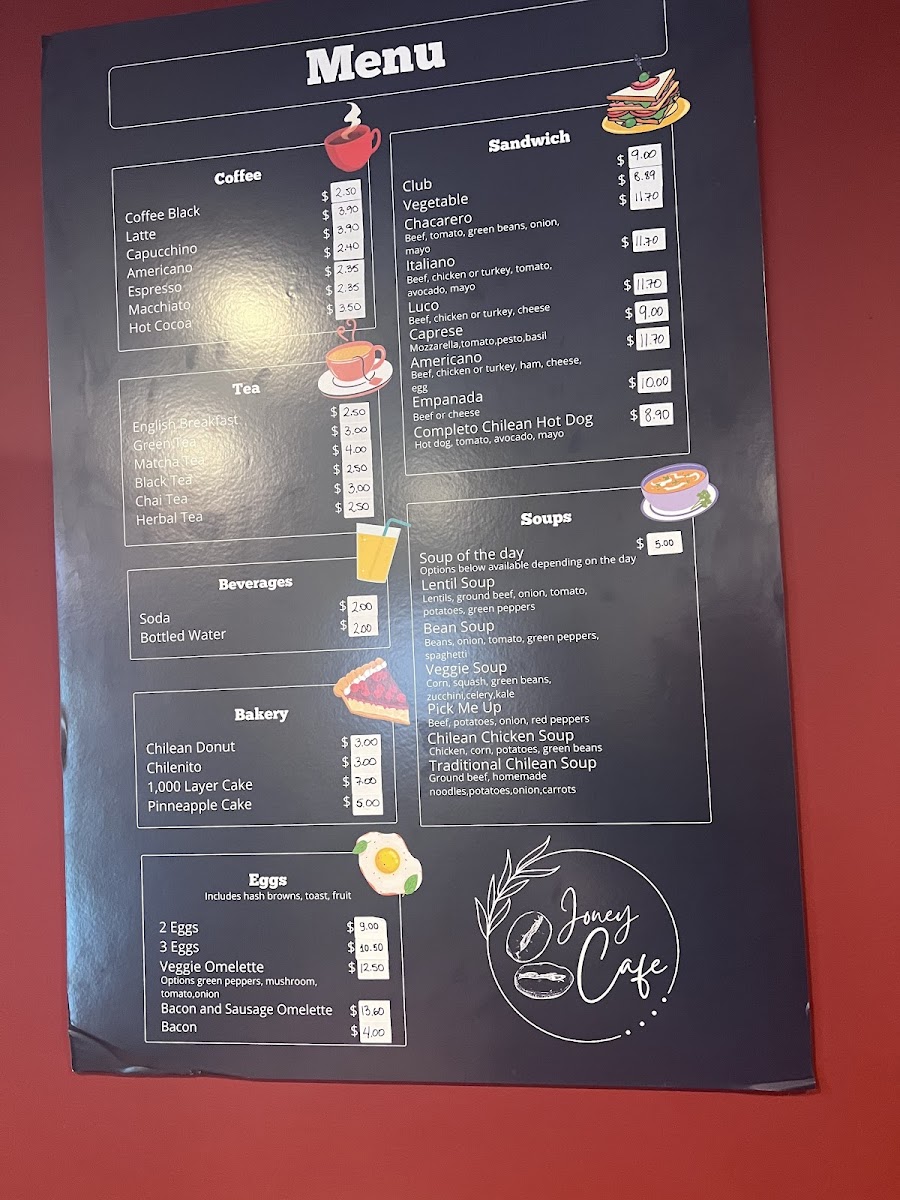 Joney Cafe offers a straightforward and inviting menu centered on simple café fare and comforting drinks. The selection features casual bites like warm empanadas, fresh avocado toast with or without egg, and satisfying sandwiches such as the Beef Italiano or the Completo Chilean Hot Dog. Alongside these, you’ll find comforting soups and hearty egg dishes served throughout the day.
